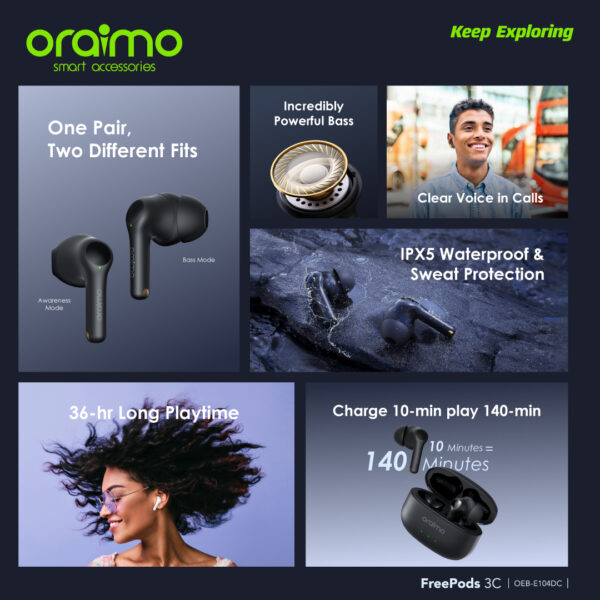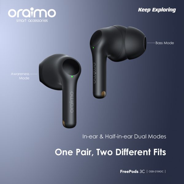 The Oraimo FreePods 3C are equipped with detachable ear tips offering two modes of listening. When the ear tips are kept attached, the BASS MODE blocks out ambient noise and reduces sound leakage for a more enhanced bass experience. Alternatively, the ear tip can be removed for the AWARENESS MODE, allowing for more comfort and awareness of the user’s surroundings.